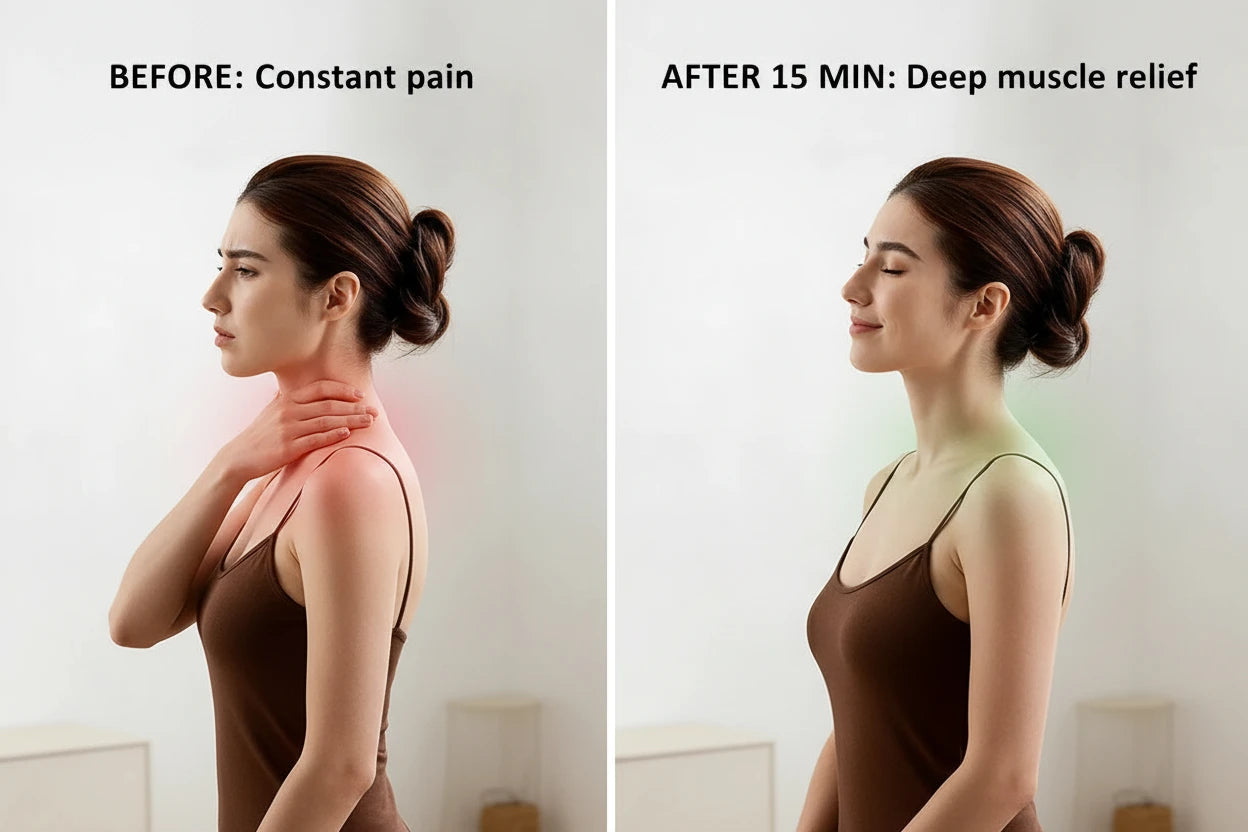 Most massagers only move in circles. Our 4D Deep-Kneading system utilizes multi-axis nodes that move inward, outward, and vertically to simulate the precise thumb-and-palm techniques of a professional masseuse. By reaching deep into the cervical spine and trapezius muscles, it identifies and "unhooks" stubborn knots that standard 2D massagers simply glide over.